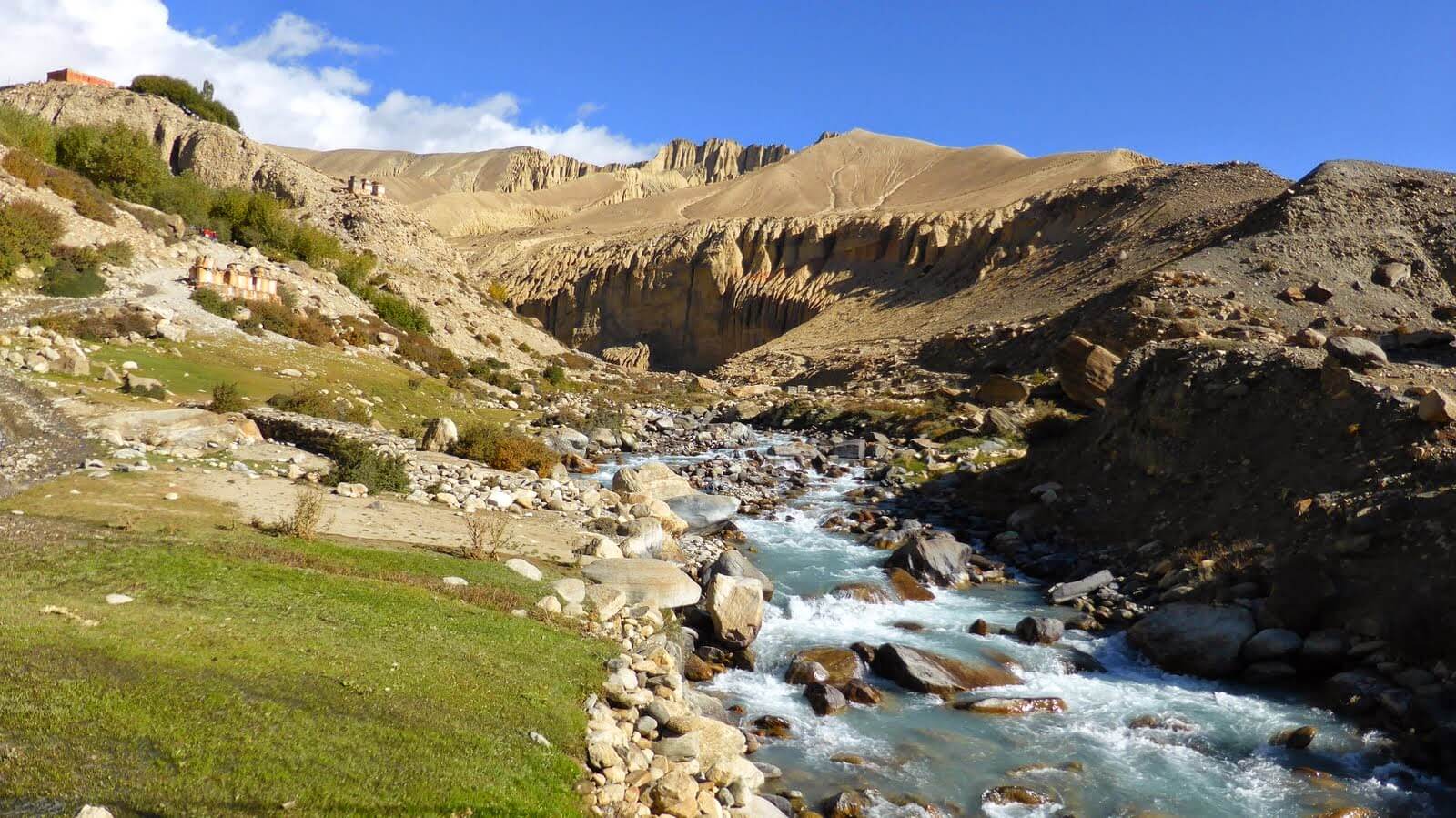 Make a short descend to a small river that flows below Tsarang, and climb the short and steep trail that becomes leveled and brad as you approached Lo Manthang in the scorching heat. It is about 4 hours walk to the final destination. En- route stop to see caves high above the steep wall.
